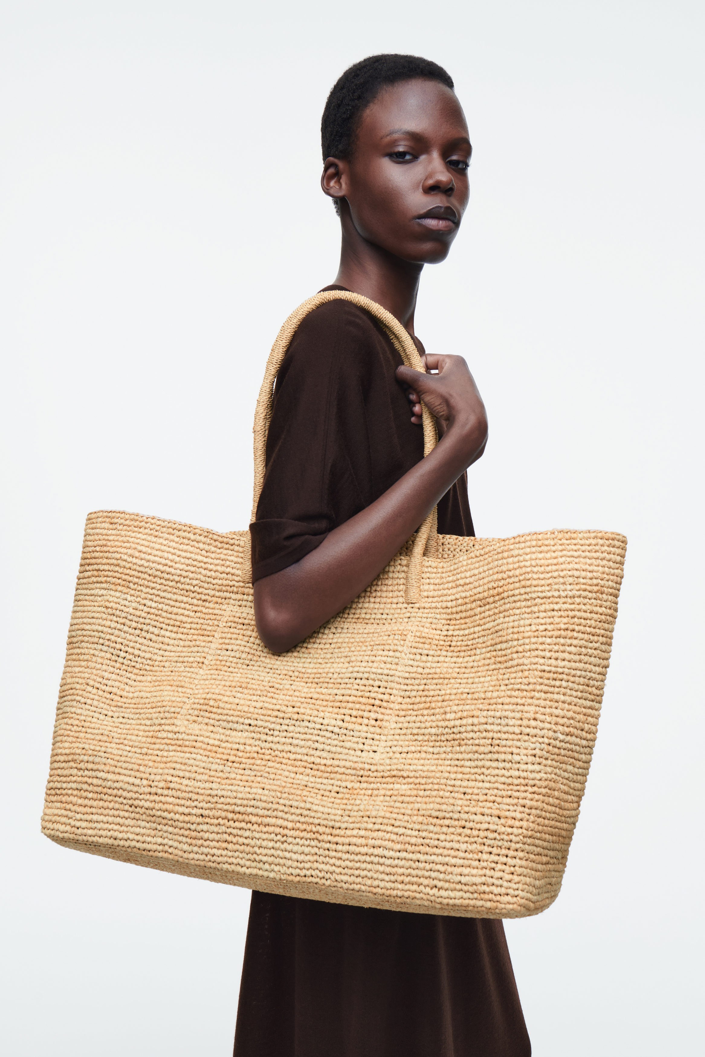 Elegant totebag som för tankarna till dagar i solen. Omsorgsfullt vävd med en naturligt beige nyans, smala axelband och ett innerfack i läder med dragkedja för dina värdesaker.