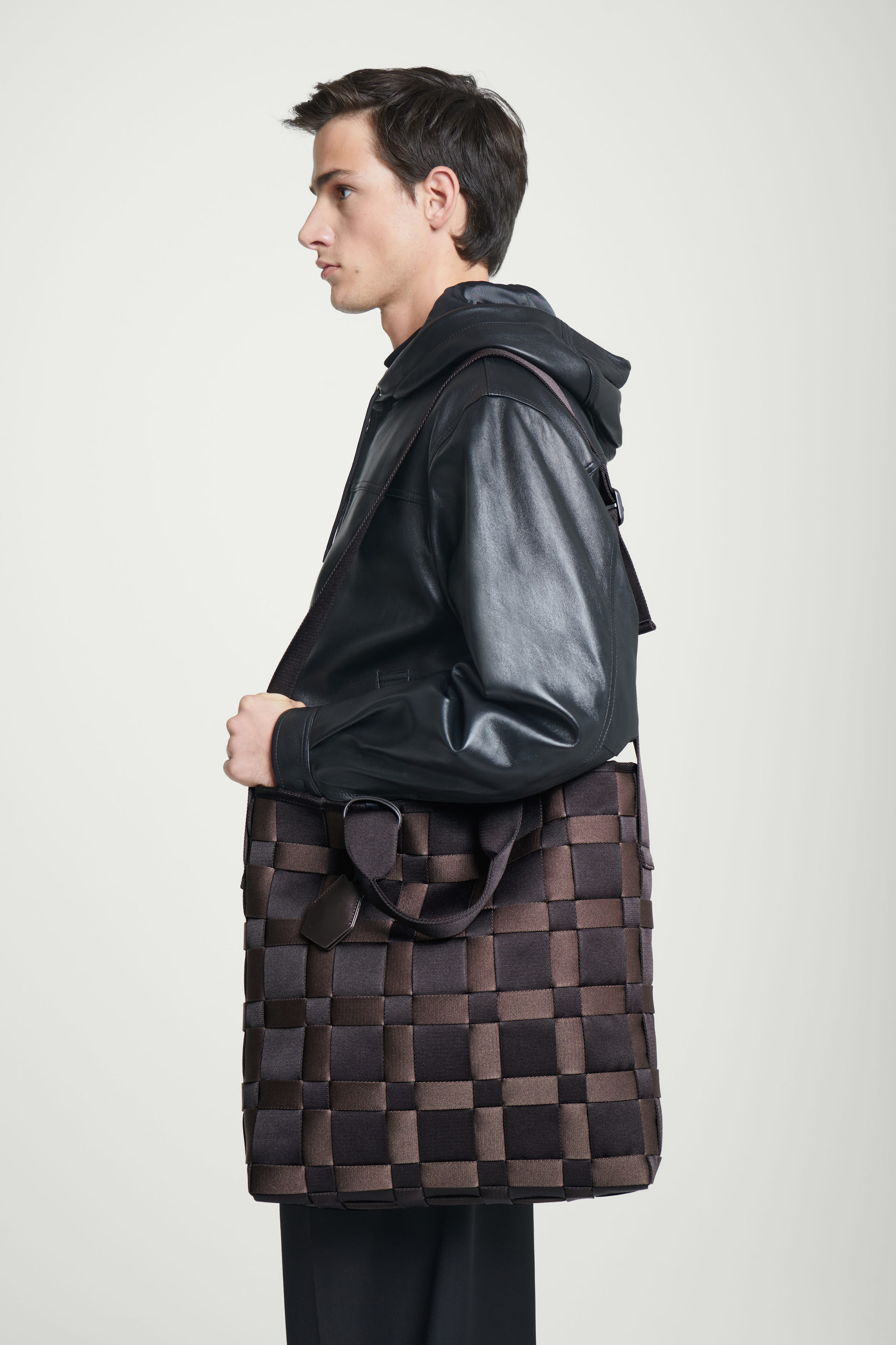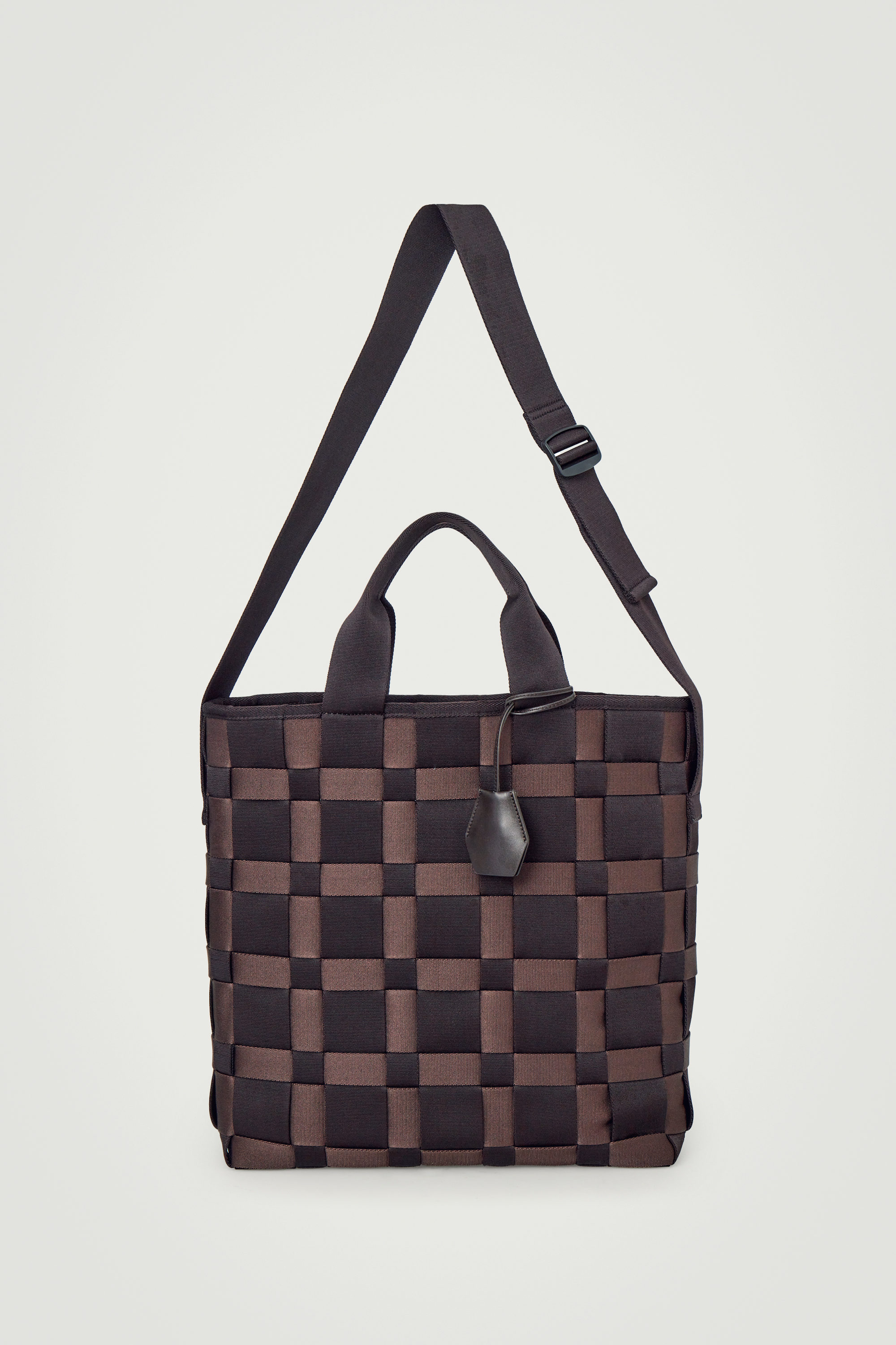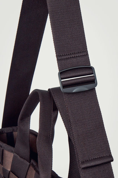 Denna moderna tygväska är både stilren och praktisk. Den är vävd av remsor i slitstark band av återvunnen polyester. Konstruktionen inkluderar en nyckelring i läder som fästs runt handtagen, ett rymligt huvudfack med en strukturerad bas för att hålla ordning på dina nödvändigheter samt en crossbody-rem med justerbar längd.